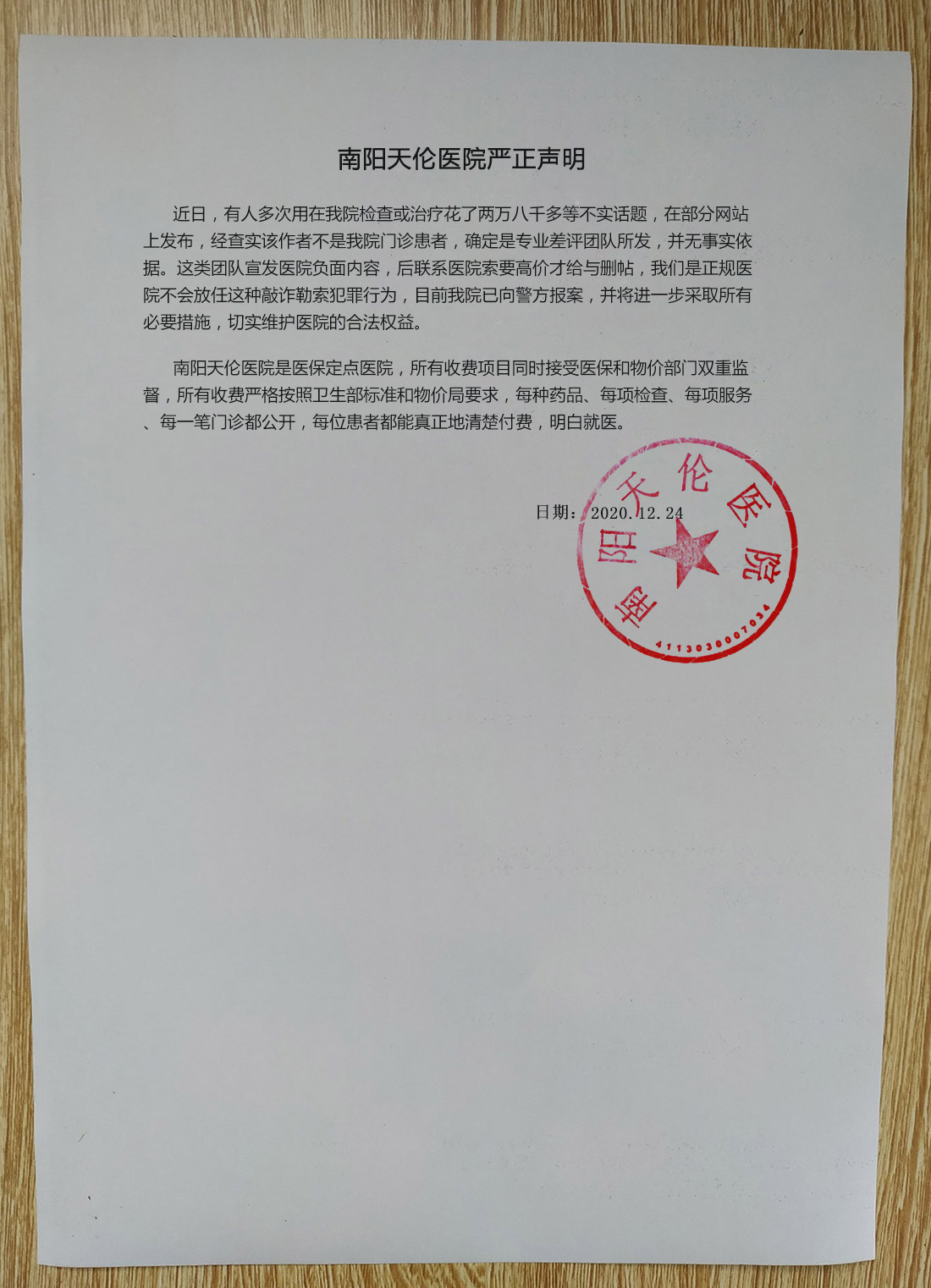 近日,有人多次用在我院检查或治疗花了两万八千多等不实话题,在部分网站上发布,经查实该作者不是我门诊患者,确定是专业差评团队所发,并无事实依据。这类团队宣发医院负面内容,后联系医院索要高价才给与删帖,我们是正规医院不会放任这种敲诈勒索犯罪行为,目前我院已向警方报案,并将进一步采取所有必要措施,切实维护医院的合法权益。