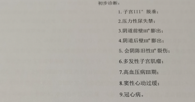 50年来,王老太太每次遇咳嗽、劳累后阴道肿物脱出,如鸡蛋大小。然而老人却没有在意,并没有去治疗,只是休息一下。近三年来,阴道脱出肿物不断增大,直到半年前,已经严重影响了她的日常生活,只要咳嗽和劳累后,便会不自主溢尿,让她痛苦不已。老太太辗转多家医院,最终来到了南阳天伦医院。找到了南阳天伦医院业务院长 张海云(南阳宫腹腔镜知名专家、南阳3D束带技术推广第一人),张院长详细了解了老人的基本情况,并仔细的为她做了妇科检查。经过全面的检查,老人最终被明确诊断:子宫III°脱垂+压力性尿失禁+阴道前壁III°膨出+阴道后壁III°膨出+会阴陈旧性II°裂伤+多发性子宫肌瘤+高血压病III期+窦性心动过缓+冠心病,需要手术治疗。
