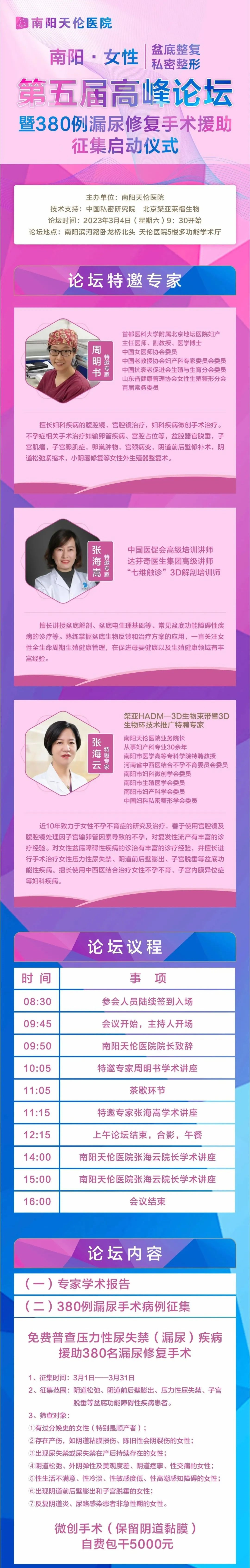 为推动南阳地区的女性盆底疾病与私密整形诊疗技术发展,进一步提升女性盆底疾病私密整形诊疗服务,提高盆底整复私密整形从业者临床诊治水平与科研能力,在三八妇女节来临之际,南阳天伦医院举行南阳女性盆底整复私密整形第五届高峰论坛,同时面向全市征集380名漏尿患者,微创手术(保留阴道黏膜)包干5000元,帮助患病的女性患者远离病痛。欢迎从事妇产、泌尿、康复、私密整形等领域的临床工作者和有健康需求的女性朋友积极参会。